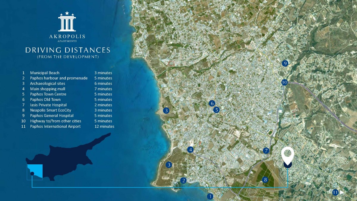 These properties are set in a quiet convenient location and only few minutes' drive from Paphos Town Center and the shops, Iasis hospital, the Neapolis University of Paphos and just ten minutes' drive to Paphos International Airport.