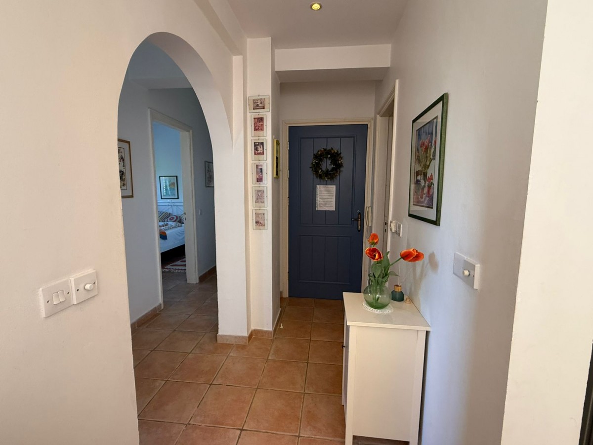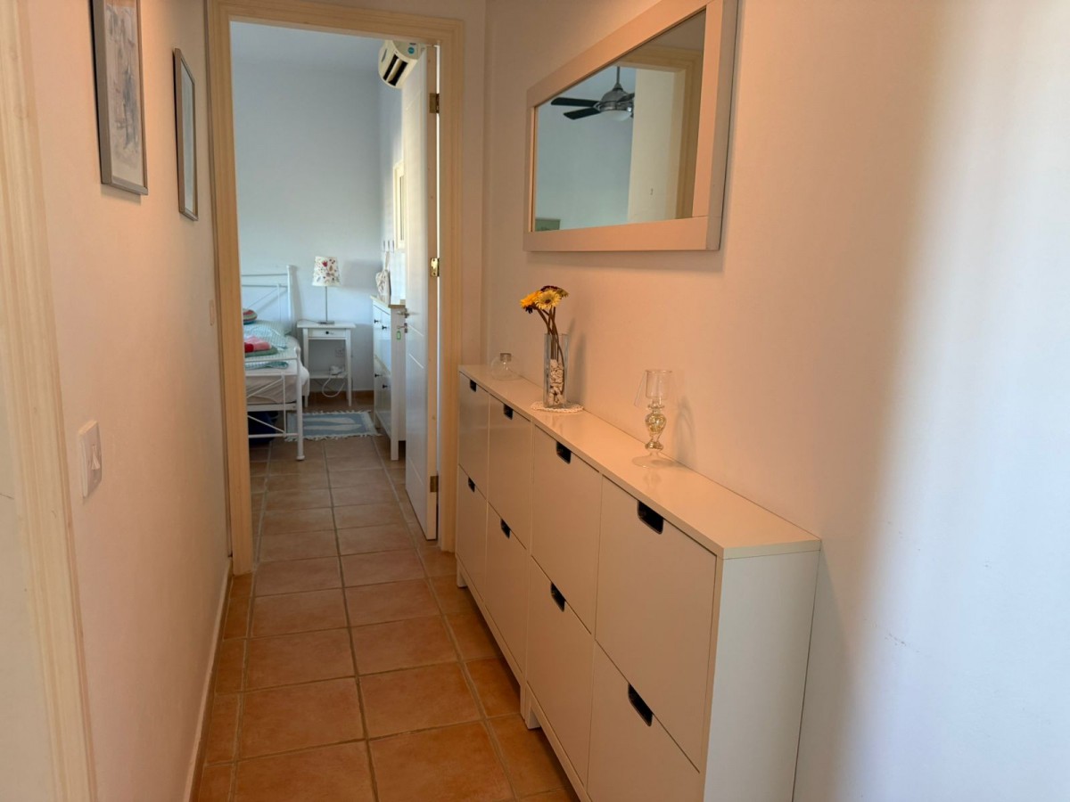 Living room with integrated kitchen separated by bar counter, 3 double bedrooms with ceiling fans, 1 bathrooms, 1 shower, new air conditioning, double glazing, external shutters, communal parking and large, communal swimming pool, fully furnished and equipped, and also has a spacious and furnished terrace.