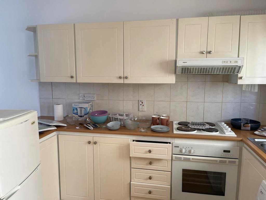 The apartment is fully furnished , open plan kitchen and a communal swimming pool.