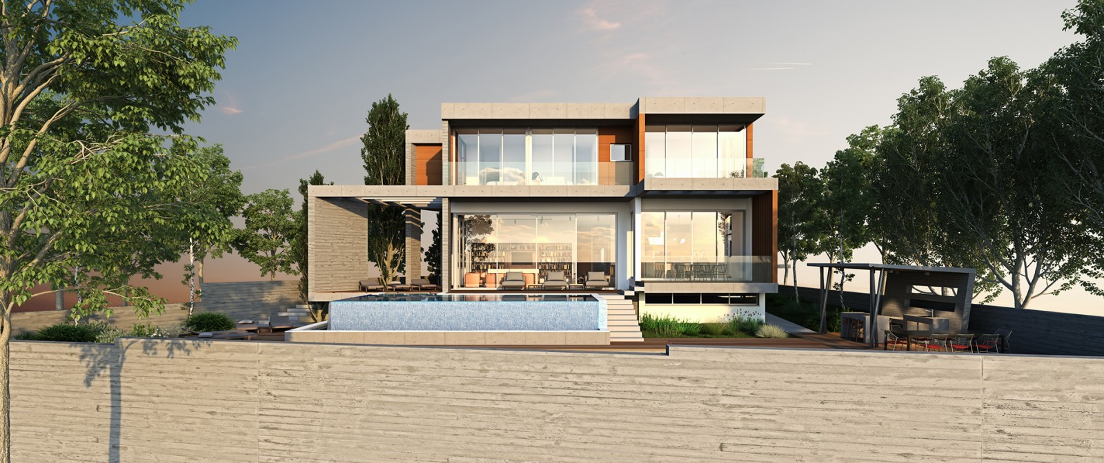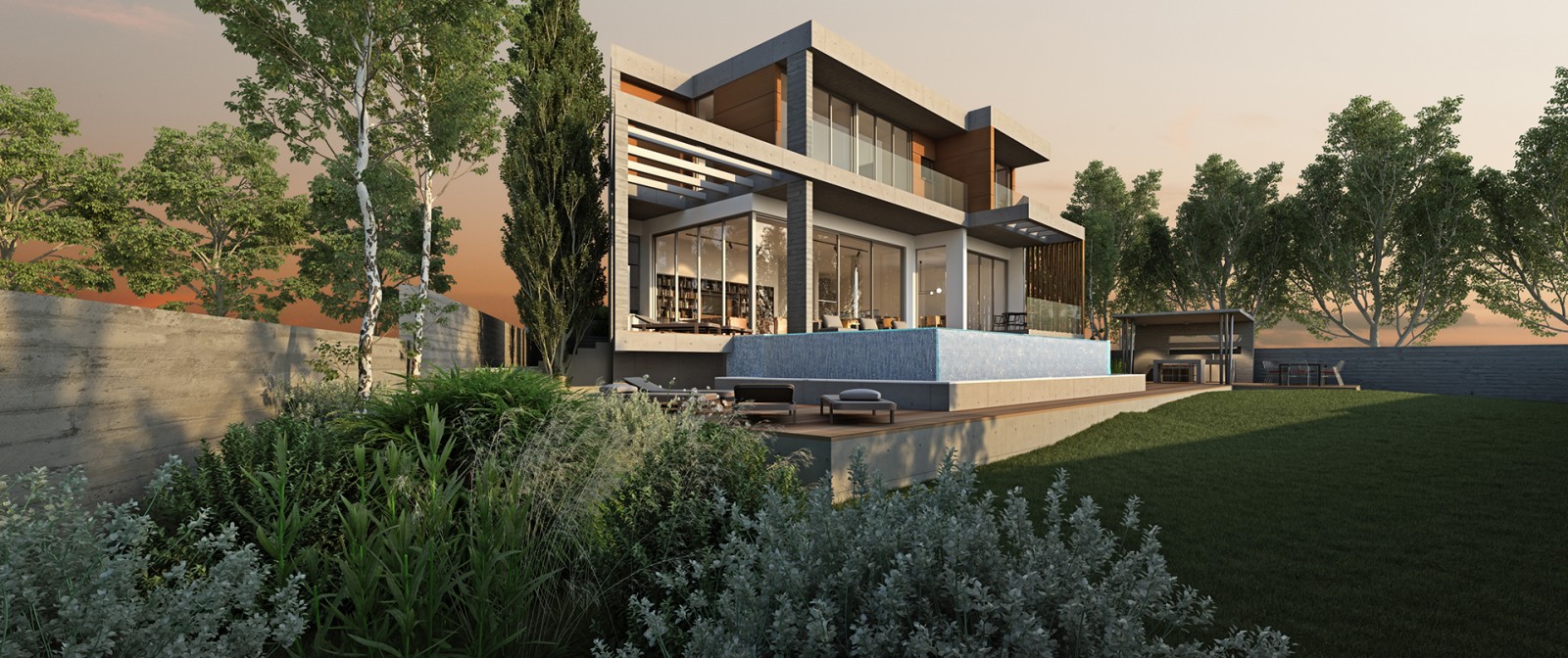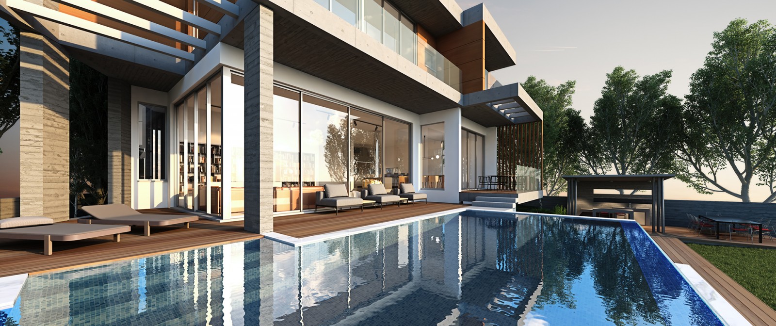 - Swimming pool overflows type with wooden decking around.