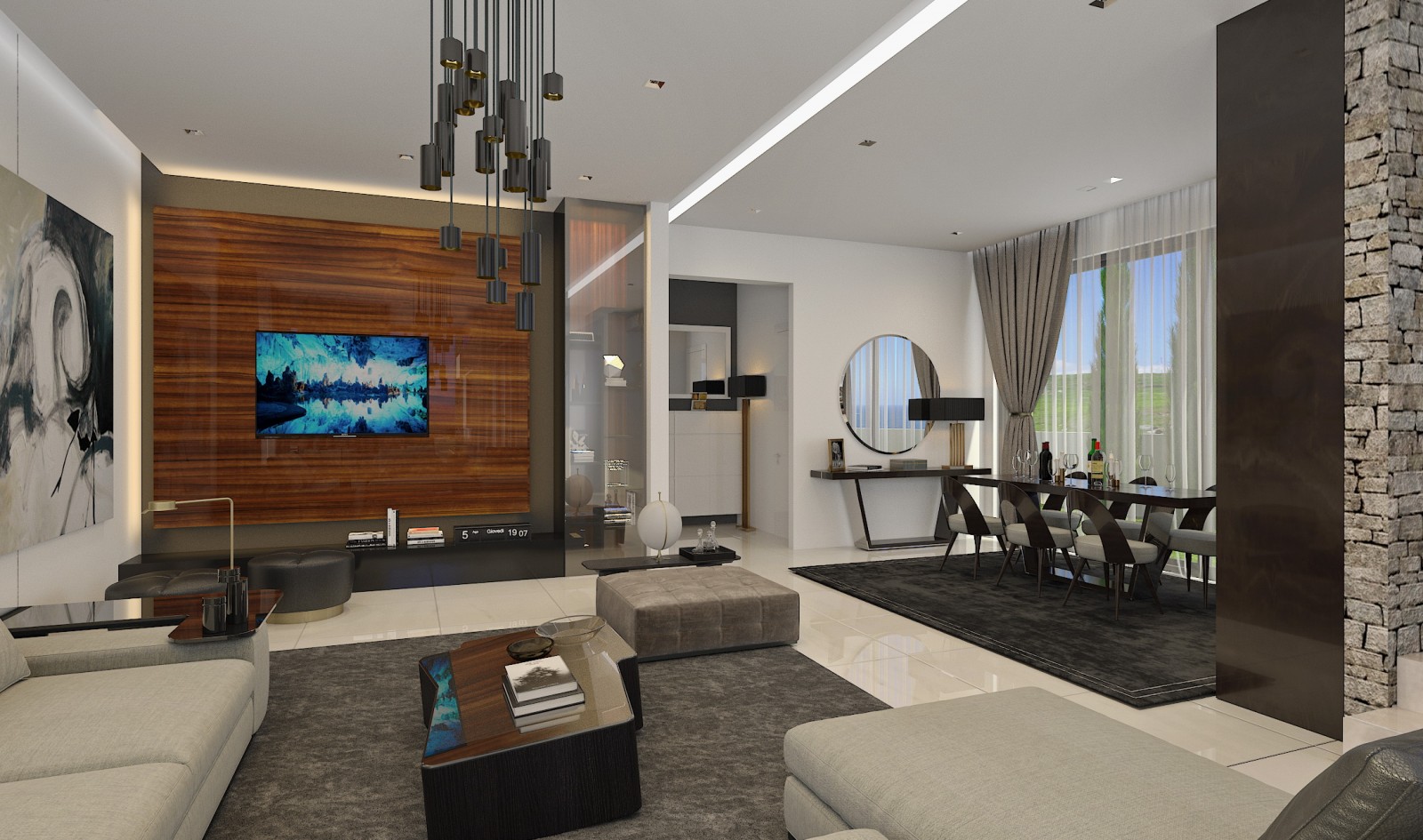 •Bright and spacious kitchen and living room areas with suspended ceilings