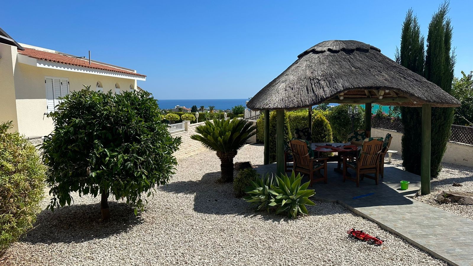 Exceptionally large and very secluded plot with beautiful mature and well maintained garden pathways; adjoined to natural streams on two sides with garden furniture, kiosk and spacious sitting area offering spectacular sea views - idyllic sunsets.